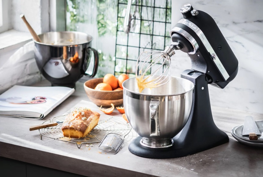 В комплекте венчик, лопатка, крюк, чаша 4.83 л с матовым покрытием, чаша без ручки 3 л и защитный обод.