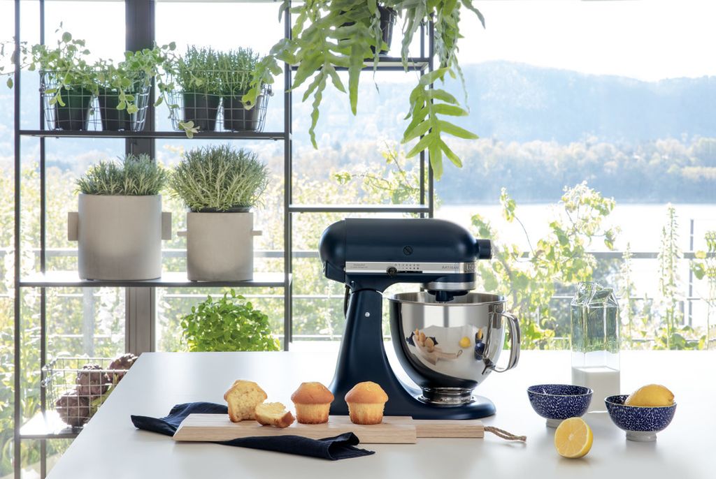 В комплекте венчик, лопатка, крюк, чаша 4.83 л с матовым покрытием, чаша без ручки 3 л и защитный обод.