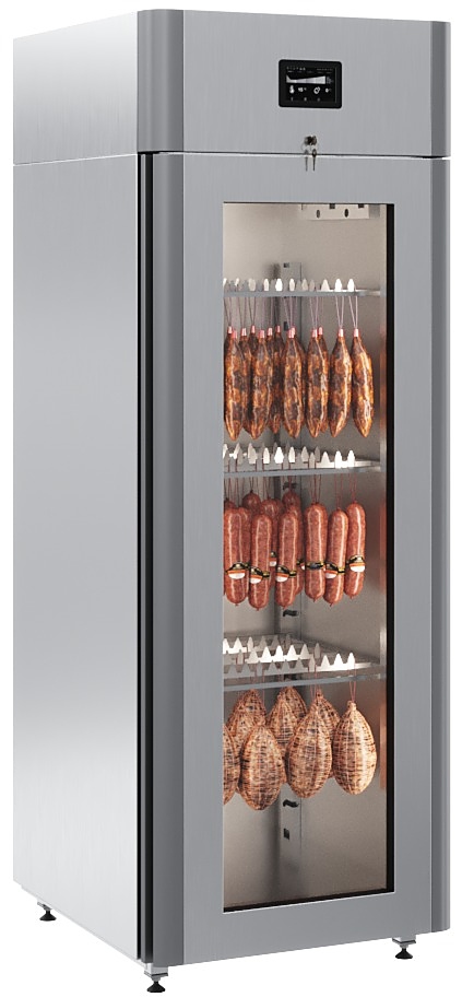 POLAIR CS107 Salami используется на предприятиях общественного питания, торговли и пищевых производствах для приготовления и хранения салями, сыровяленых колбас и прочих мясных деликатесов. шкаф оснащен 3 парами направляющих с 3 перекладинами для подвеса колбас, внутренней подсветкой и рассчитан на работу при температуре окружающей среды до 40 °С. Аппарат оснащен встроенным увлажнителем и должен был подключен к системе подачи воды с обязательной водоочисткой и центральной канализации. Материал корпуса - нержавеющая сталь, материал двери - стеклопакет.