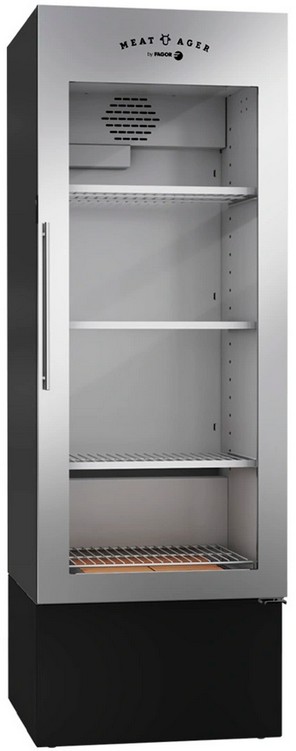 Шкаф Fagor FMA-1650 B S используется для охлаждения, хранения и вызревания мяса, птицы, колбасы, рыбы, ветчины, сыра и салями на предприятиях общественного питания, торговли, пищевых производствах и в домашних условиях. Модель оснащена электронным управлением, цифровым дисплеем, сигнализацией при изменении температуры, УФ лампой, магнитным уплотнителем, светодиодным освещением, замком двери, съемными решетками, 2 передними регулируемыми ножками и 4 задними роликами и черной подставкой. Материал корпуса - черная сталь, материал внутренней отделки - высококачественная нержавеющая сталь AISI 304 толщиной 60 мм, материал двери - двойной стеклопакет.