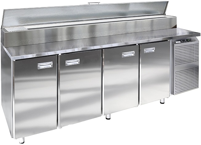Стол для пиццы Finist СХСпц-700-4 предназначается для охлаждения и кратковременного хранения продуктов перед приготовлением, а также обработки ингредиентов на предприятиях общественного питания, торговли и пищевых производствах. Стол установлен на 4 регулируемые ножки. Модель оснащена столешницей с крышкой, евровилкой, цифровым дисплеем, автоматической оттайкой испарителя и кнопочной панелью управления. Материал корпуса, столешницы, распашных дверей - высококачественная нержавеющая сталь, материал задней стенки и нижней панели - оцинкованная сталь.