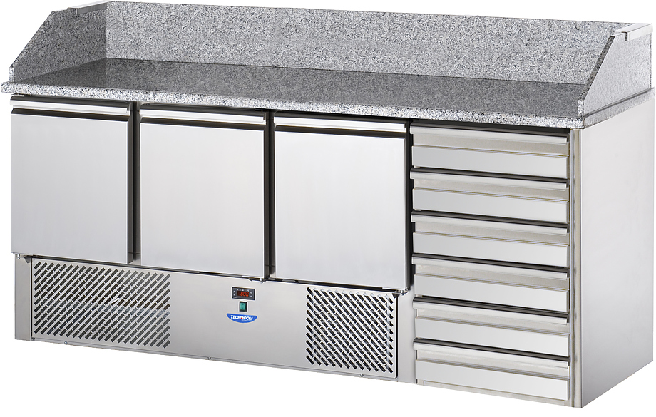 Стол для пиццы Tecnodom SLV03C6 используется на предприятиях общественного питания, торговли и пищевых производствах для раскатки теста и обработки ингредиентов перед приготовлением пиццы, а также для охлаждения и кратковременного хранения различных блюд, напитков и продуктов. Данная модель оснащена электронным управлением, NTC датчиком, динамическим охлаждением, автоматической оттайкой, испарителем с антикоррозионной обработкой и самозакрывающимися дверьми с магнитным уплотнителем. Материал корпуса - высококачественная нержавеющая сталь, материал рабочей поверхности - гранит, материал теплоизоляции - полиуретан, материал контейнеров - полипропилен.