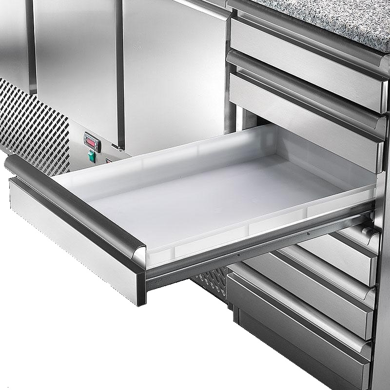 Стол для пиццы Tecnodom SLV02C6 используется на предприятиях общественного питания, торговли и пищевых производствах для раскатки теста и обработки ингредиентов перед приготовлением пиццы, а также для охлаждения и кратковременного хранения различных блюд, напитков и продуктов. Данная модель оснащена электронным управлением, NTC датчиком, динамическим охлаждением, автоматической оттайкой, испарителем с антикоррозионной обработкой и самозакрывающимися дверьми с магнитным уплотнителем. Материал корпуса - высококачественная нержавеющая сталь, материал рабочей поверхности - гранит, материал теплоизоляции - полиуретан, материал контейнеров - полипропилен.
