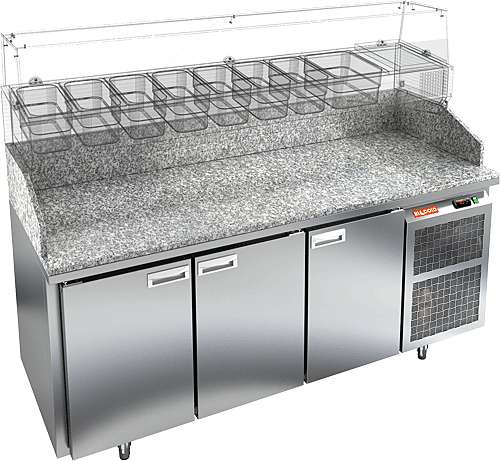 Стол для пиццы HICOLD PZ3-111/SN используется на предприятиях общественного питания, торговли и пищевых производствах для раскатки теста и обработки ингредиентов, используемых для приготовления пиццы, салатов и других блюд, а также для охлаждения и кратковременного хранения скоропортящихся продуктов и напитков. Модель совмещает в себе рабочую поверхность и охлаждаемый объем, что значительно упрощает работу повара, так как все необходимые компоненты всегда находятся под рукой. Материал корпуса - нержавеющая сталь, материал столешницы - гранит.