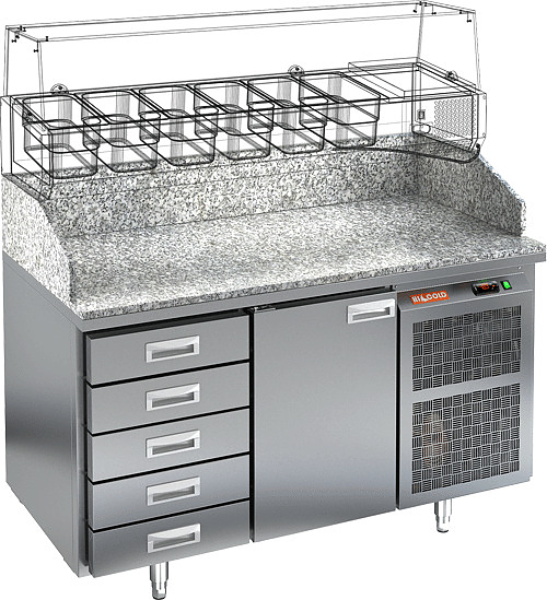 Стол для пиццы HICOLD PZ4-1/GN используется на предприятиях общественного питания, торговли и пищевых производствах для раскатки теста и обработки ингредиентов, используемых для приготовления пиццы, салатов и других блюд, а также для охлаждения и кратковременного хранения скоропортящихся продуктов и напитков. Модель совмещает в себе рабочую поверхность и охлаждаемый объем, что значительно упрощает работу повара, так как все необходимые компоненты всегда находятся под рукой. Материал корпуса - нержавеющая сталь, материал столешницы - гранит.