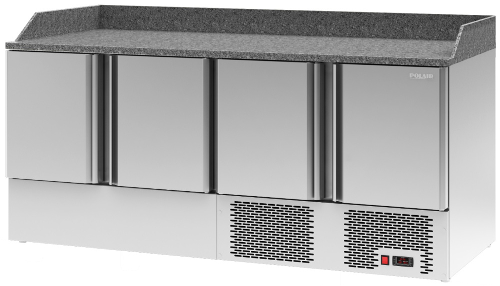 Холодильный стол для пиццы POLAIR TMi4GNpizza-G серии Grande используется на предприятиях общественного питания, торговли и пищевых производствах для раскатки теста, хранения и обработки ингредиентов перед приготовлением пиццы. Модель оснащена автоматической оттайкой, электронным терморегулятором и регулируемыми ножками. Материал внешнего и внутреннего корпуса и дверей - высококачественная нержавеющая сталь, материал столешницы и борта - натуральный гранит, материал теплоизоляции - пенополиуретан, материал полок - окрашенная проволока.