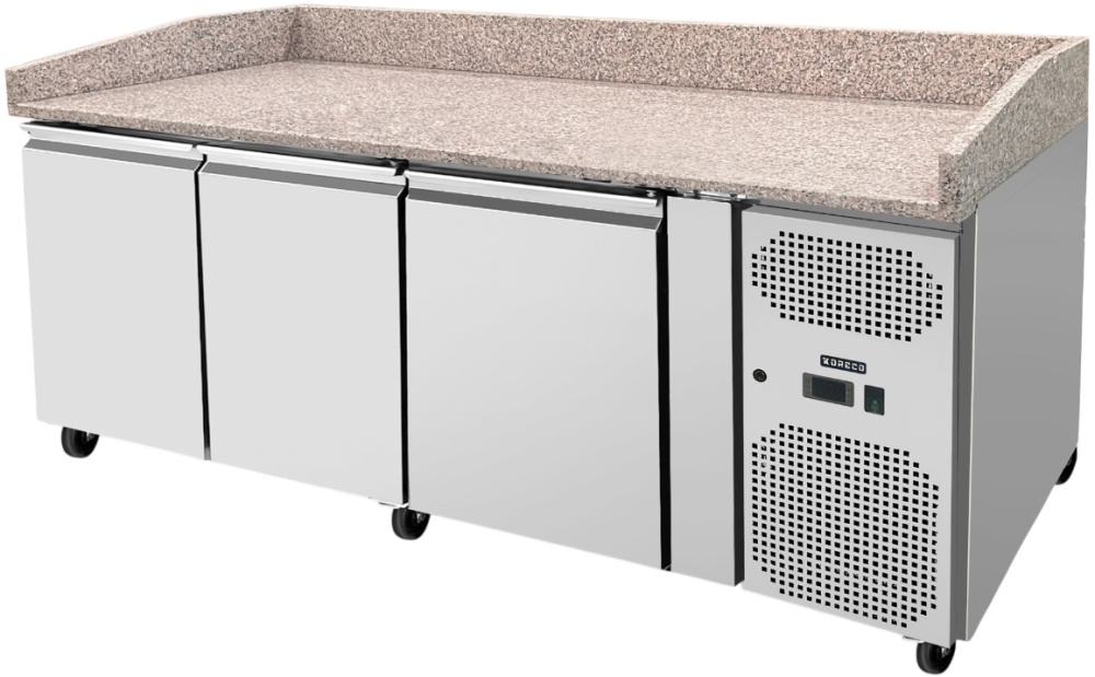 Холодильный стол для пиццы Koreco SPZ 3600 TN используется на предприятиях общественного питания и торговли для раскатки теста и обработки ингредиентов для приготовления пиццы, охлаждения и кратковременного хранения скоропортящихся продуктов и напитков. Корпус выполнен из нержавеющей стали AISI 304, бортик - из гранита.