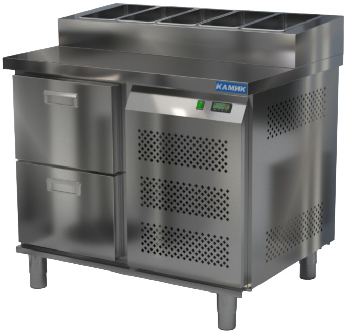 Холодильный стол КАМИК СОП-021076 используется на предприятиях общественного питания и торговли для охлаждения и хранения продуктов, напитков и готовых блюд, а также для раскатки теста и обработки ингредиентов для приготовления пиццы. Конструкция разделена на секции, каждая из которых оборудована сетчатой полкой и парой направляющих. Корпус выполнен из нержавеющей стали AISI 430 толщиной 1 мм, столешница - из нержавеющей стали AISI 304 толщиной 1 мм.
