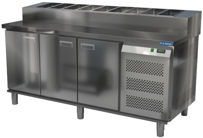 Холодильный стол КАМИК СОП-3018573 используется на предприятиях общественного питания и торговли для охлаждения и хранения продуктов, напитков и готовых блюд, а также для раскатки теста и обработки ингредиентов для приготовления пиццы. Конструкция разделена на секции, каждая из которых оборудована сетчатой полкой и парой направляющих. Корпус выполнен из нержавеющей стали AISI 430 толщиной 1 мм, столешница - из нержавеющей стали AISI 304 толщиной 1 мм.