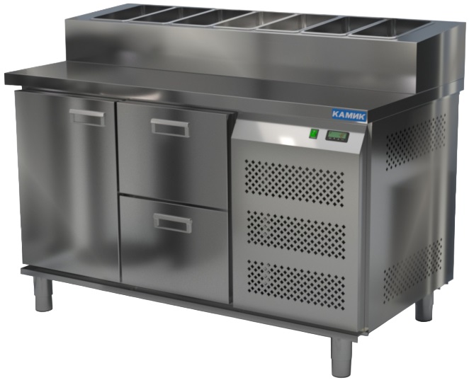 Холодильный стол КАМИК СОП-121476 используется на предприятиях общественного питания и торговли для охлаждения и хранения продуктов, напитков и готовых блюд, а также для раскатки теста и обработки ингредиентов для приготовления пиццы. Конструкция разделена на секции, каждая из которых оборудована сетчатой полкой и парой направляющих. Корпус выполнен из нержавеющей стали AISI 430 толщиной 1 мм, столешница - из нержавеющей стали AISI 304 толщиной 1 мм.