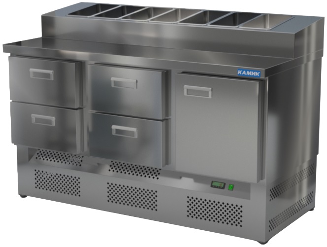 Холодильный стол КАМИК СОП-141573Н используется на предприятиях общественного питания и торговли для охлаждения и хранения продуктов, напитков и готовых блюд, а также для раскатки теста и обработки ингредиентов для приготовления пиццы. Конструкция разделена на секции, каждая из которых оборудована сетчатой полкой и парой направляющих. Корпус выполнен из нержавеющей стали AISI 430 толщиной 1 мм, столешница - из нержавеющей стали AISI 304 толщиной 1 мм.