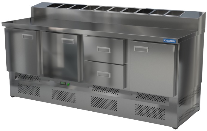 Холодильный стол КАМИК СОП-322076Н используется на предприятиях общественного питания и торговли для охлаждения и хранения продуктов, напитков и готовых блюд, а также для раскатки теста и обработки ингредиентов для приготовления пиццы. Конструкция разделена на секции, каждая из которых оборудована сетчатой полкой и парой направляющих. Корпус выполнен из нержавеющей стали AISI 430 толщиной 1 мм, столешница - из нержавеющей стали AISI 304 толщиной 1 мм.