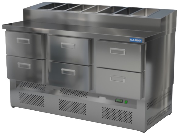 Холодильный стол КАМИК СОП-061576Н используется на предприятиях общественного питания и торговли для охлаждения и хранения продуктов, напитков и готовых блюд, а также для раскатки теста и обработки ингредиентов для приготовления пиццы. Конструкция разделена на секции, каждая из которых оборудована сетчатой полкой и парой направляющих. Корпус выполнен из нержавеющей стали AISI 430 толщиной 1 мм, столешница - из нержавеющей стали AISI 304 толщиной 1 мм.