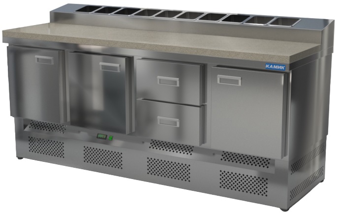 Холодильный стол КАМИК СОП-322073КН используется на предприятиях общественного питания и торговли для охлаждения и хранения продуктов, напитков и готовых блюд, а также для раскатки теста и обработки ингредиентов для приготовления пиццы. Конструкция разделена на секции, каждая из которых оборудована сетчатой полкой и парой направляющих. Корпус выполнен из нержавеющей стали AISI 430 толщиной 1 мм, столешница - из нержавеющей стали AISI 304 толщиной 1 мм.