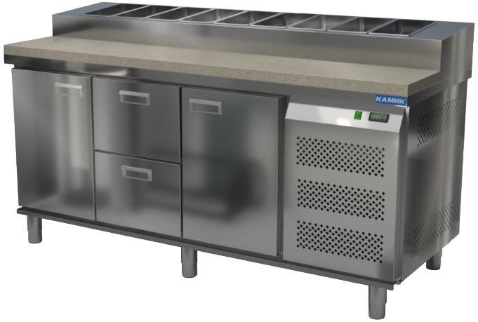 Холодильный стол КАМИК СОП-2218576К используется на предприятиях общественного питания и торговли для охлаждения и хранения продуктов, напитков и готовых блюд, а также для раскатки теста и обработки ингредиентов для приготовления пиццы. Конструкция разделена на секции, каждая из которых оборудована сетчатой полкой и парой направляющих. Корпус выполнен из нержавеющей стали AISI 430 толщиной 1 мм, столешница - из нержавеющей стали AISI 304 толщиной 1 мм.