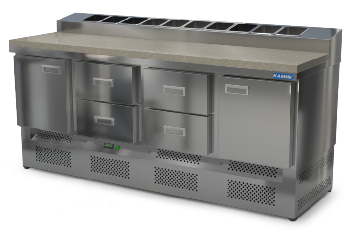 Холодильный стол КАМИК СОП-242073КН используется на предприятиях общественного питания и торговли для охлаждения и хранения продуктов, напитков и готовых блюд, а также для раскатки теста и обработки ингредиентов для приготовления пиццы. Конструкция разделена на секции, каждая из которых оборудована сетчатой полкой и парой направляющих. Корпус выполнен из нержавеющей стали AISI 430 толщиной 1 мм, столешница - из нержавеющей стали AISI 304 толщиной 1 мм.