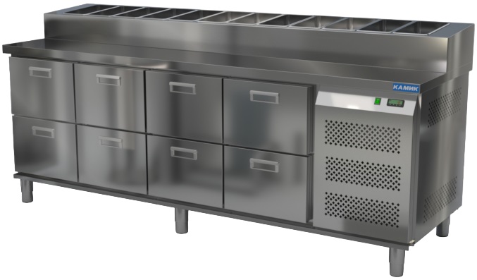 Холодильный стол КАМИК СОП-082373 используется на предприятиях общественного питания и торговли для охлаждения и хранения продуктов, напитков и готовых блюд, а также для раскатки теста и обработки ингредиентов для приготовления пиццы. Конструкция разделена на секции, каждая из которых оборудована сетчатой полкой и парой направляющих. Корпус выполнен из нержавеющей стали AISI 430 толщиной 1 мм, столешница - из нержавеющей стали AISI 304 толщиной 1 мм.