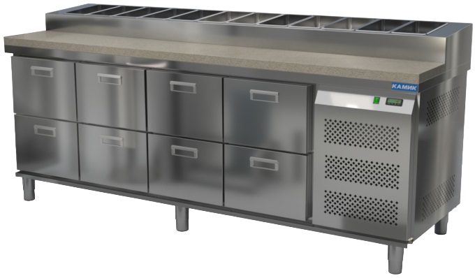 Холодильный стол КАМИК СОП-082373К используется на предприятиях общественного питания и торговли для охлаждения и хранения продуктов, напитков и готовых блюд, а также для раскатки теста и обработки ингредиентов для приготовления пиццы. Конструкция разделена на секции, каждая из которых оборудована сетчатой полкой и парой направляющих. Корпус выполнен из нержавеющей стали AISI 430 толщиной 1 мм, столешница - из нержавеющей стали AISI 304 толщиной 1 мм.