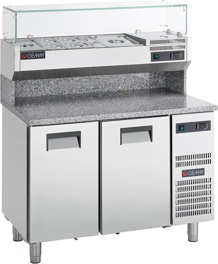 Холодильный стол Gemm SMR/12 серии NEW SMART предназначен для раскатки теста, обработки ингредиентов для приготовления пиццы, охлаждения и кратковременного хранения скоропортящихся продуктов и напитков на предприятиях общественного питания и торговли. Модель оснащена охлаждаемой витриной для контейнеров на гранитном бортике со стеклянной крышкой и цифровым термостатом. Столешница выполнена из гранита.