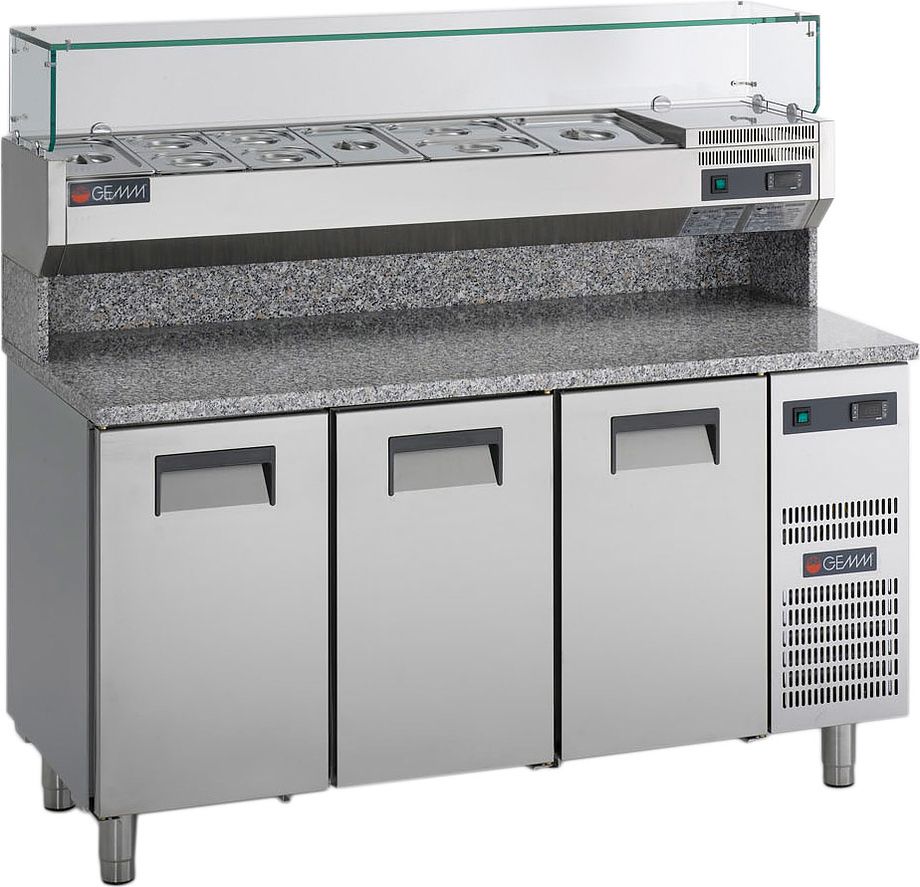 Холодильный стол Gemm SMR/16 серии NEW SMART предназначен для раскатки теста, обработки ингредиентов для приготовления пиццы, охлаждения и кратковременного хранения скоропортящихся продуктов и напитков на предприятиях общественного питания и торговли. Модель оснащена охлаждаемой витриной для контейнеров на гранитном бортике со стеклянной крышкой и цифровым термостатом. Столешница выполнена из сардинского гранита.