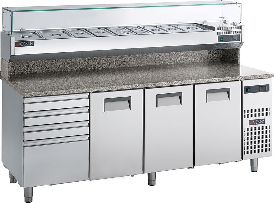 Холодильный стол Gemm SMR/20C серии NEW SMART предназначен для раскатки теста, обработки ингредиентов для приготовления пиццы, охлаждения и кратковременного хранения скоропортящихся продуктов и напитков на предприятиях общественного питания и торговли. Модель оснащена охлаждаемой витриной для контейнеров на гранитном бортике со стеклянной крышкой и цифровым термостатом. Столешница выполнена из сардинского гранита.