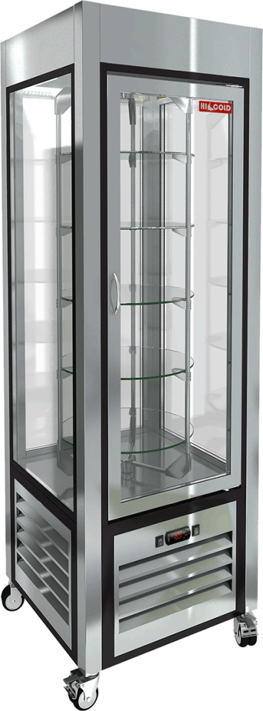 Кондитерская витрина HICOLD VRC 350 R FR используется на предприятиях общественного питания и торговли для демонстрации, охлаждения и кратковременного хранения кондитерских изделий и десертов. Модель оснащена 5 вращающимися полками, светодиодной подсветкой и колесами со стопорами. Корпус выполнен из нержавеющей стали.