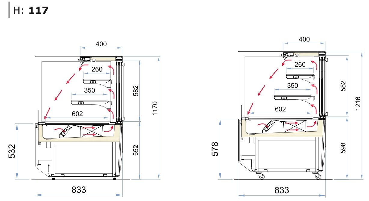 Модель оснащена распашными дверцами со стороны оператора, что позволяет изолировать охлаждаемый объем от проникновения внешнего тепла. Каркас и основание витрины, а также передняя техническая панель изготовлены из углеродистой стали, окрашенной порошковой краской, зона выкладки, рабочая поверхность, задняя панель, передняя нижняя решётка, кронштейны полок и перфорированные стойки для фиксации кронштейнов на разной высоте - из нержавеющей стали. Цельный корпус имеет изоляцию из пенополиуретана, вспененного углекислотой, без использования озоноразрушающих веществ.