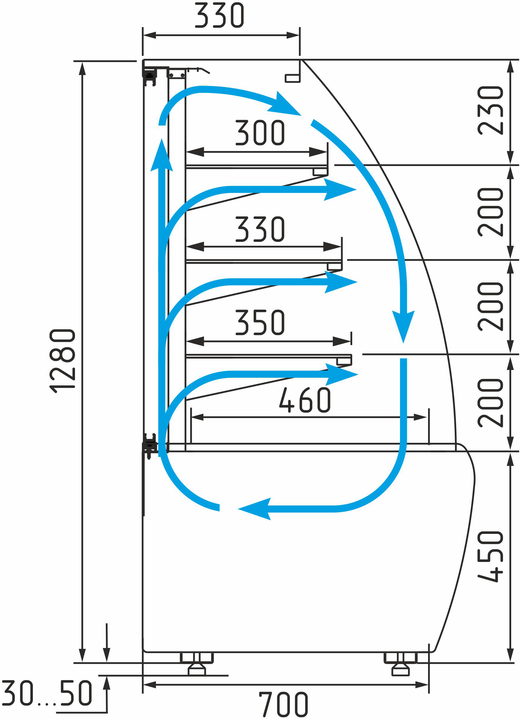 Открытая кондитерская витрина Carboma K70 VM 0,9-2 (ВХСв - 0,9д Техно) используется на предприятиях общественного питания и торговли для демонстрации, охлаждения и кратковременного хранения тортов, пирожных и других кондитерских изделий. Модель оснащена распашными задними створками со стеклопакетом, 3 охлаждаемыми фиксированными полками и регулируемыми ножками высотой от 30 до 50 мм. Отсутствие переднего стекла позволяет использовать витрину в зоне самообслуживания. Основание и декоративные панели выполнены из стали, боковины - из пластика с пенополиуретановой теплоизоляцией.