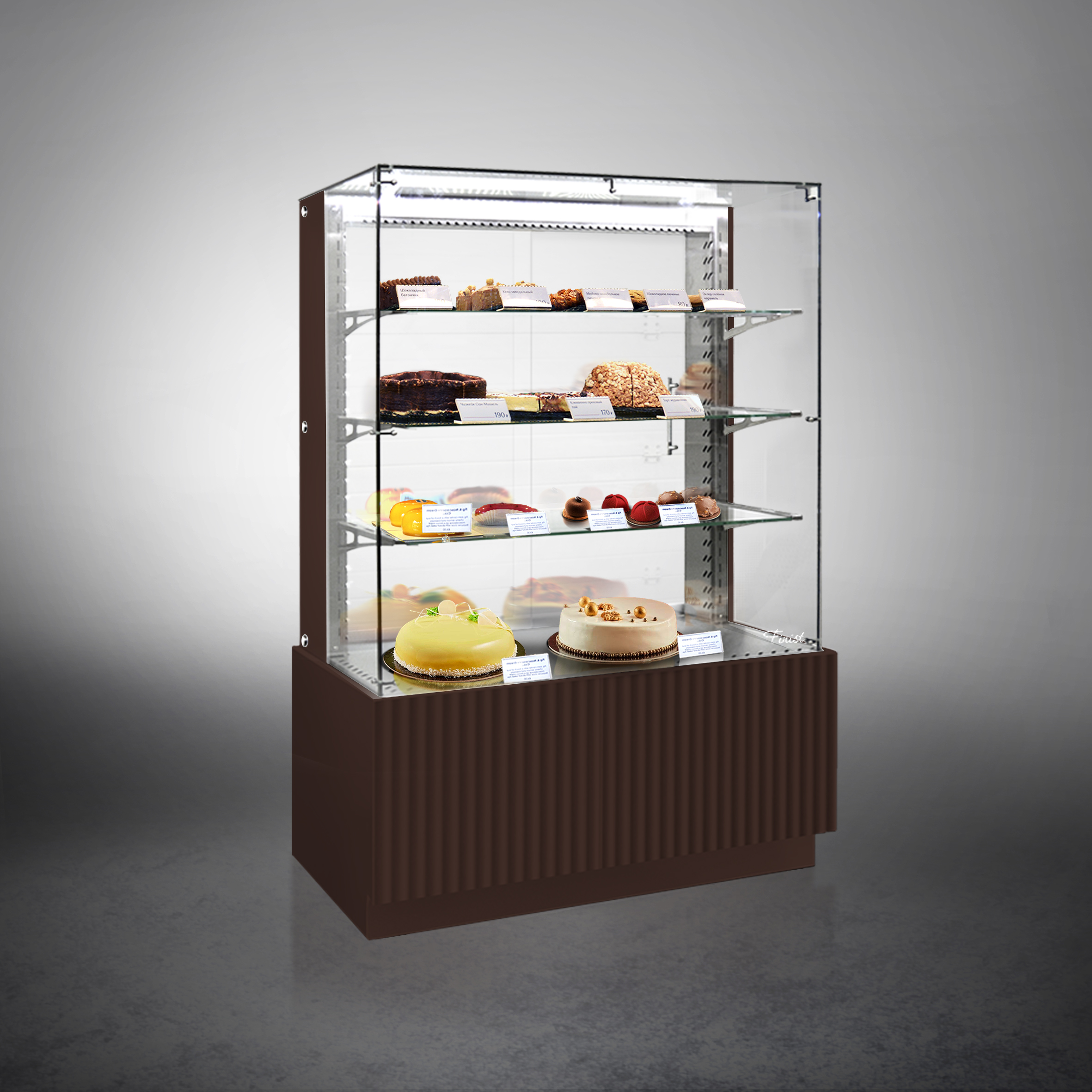 Холодильная витрина Finist AIR LUX AL-10-7-163 используется для демонстрационной выкладки, охлаждения и хранения кондитерских и хлебобулочных изделий на предприятиях общественного питания и торговли. Модель оснащена микропроцессорным блоком, автоматической оттайкой, светодиодной подсветкой каждой полки, 3 стеклянными полками и удобными дверцами купе. Материал фронтальных и боковых панелей облицовки - МДФ панели, материал купола и полок - просветленное стекло, материал дна - зеркальная нержавеющая сталь.