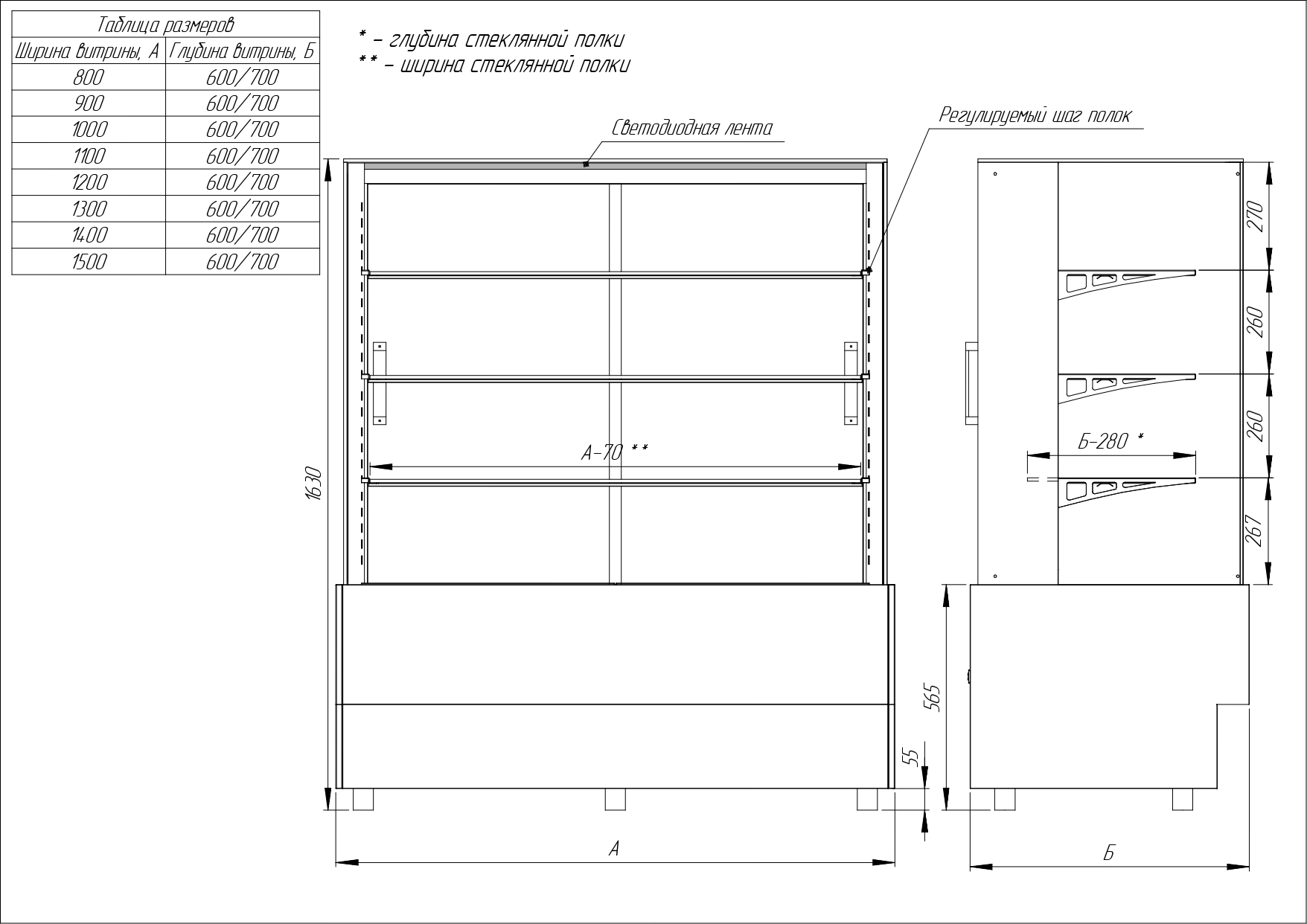Холодильная витрина Finist AIR A-14-7-163 используется для демонстрационной выкладки, охлаждения и хранения кондитерских и хлебобулочных изделий на предприятиях общественного питания и торговли. Модель оснащена микропроцессорным блоком, автоматической оттайкой, светодиодной подсветкой каждой полки, 3 стеклянными полками и удобными дверцами купе. Материал цельнозаливного корпуса - окрашенная сталь, материал купола и полок - просветленное стекло, материал дна - зеркальная нержавеющая сталь.