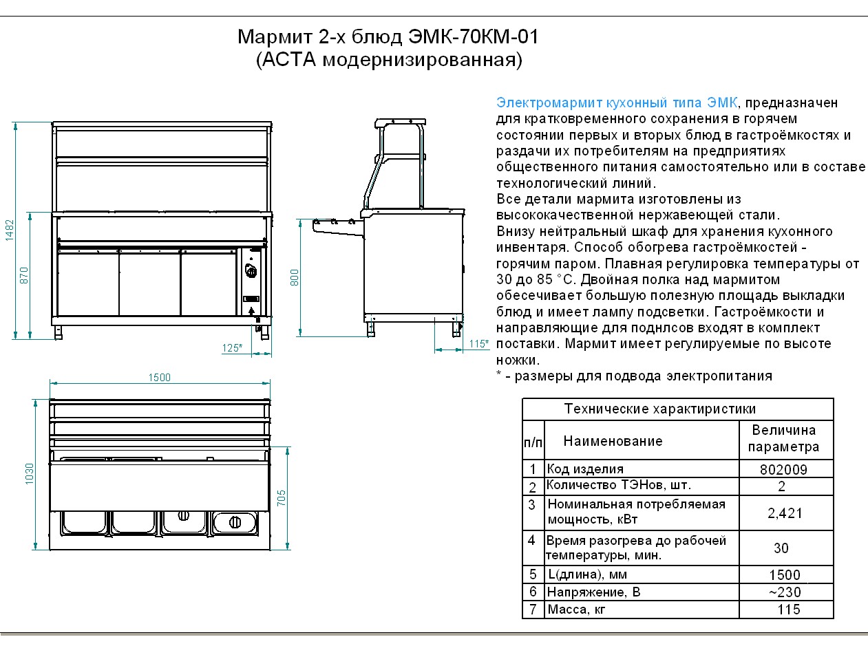 Мармит Abat ЭМК-70КМ-01 предназначен для демонстрации, кратковременного хранения и поддержания вторых блюд в горячем состоянии в составе линий раздач на предприятиях общественного питания и торговли. Модель оснащена регулируемыми по высоте ножками.