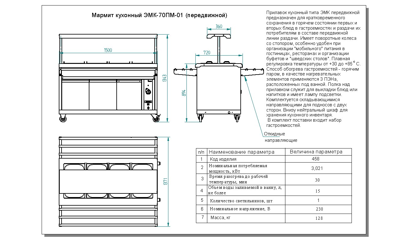 Мармит Abat ЭМК-70ПМ-01 предназначен для демонстрации, кратковременного хранения и поддержания вторых блюд в горячем состоянии в составе линий раздач на предприятиях общественного питания и торговли. Модель оснащена регулируемыми по высоте ножками.