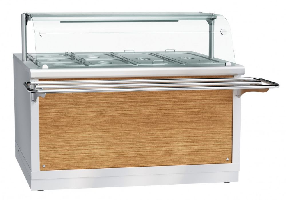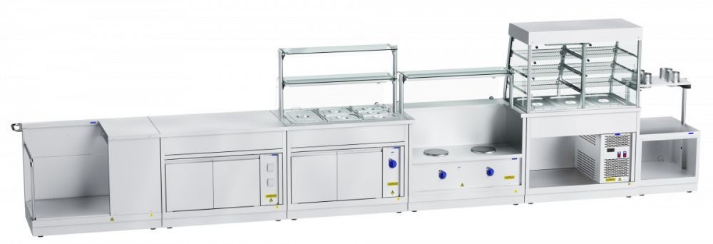 В комплект поставки входят 2 гастроемкости GN 1/1 глубиной 150 мм, 2 гастроемкости GN 1/2 глубиной 150 мм, 3 гастроемкости GN 1/3 глубиной 150 мм и направляющая для подносов.