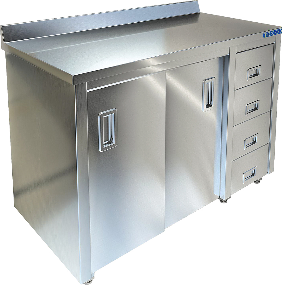 Производственный стол-тумба Техно-ТТ СПС-226/1800-П предназначен для разделки и обработки пищевых продуктов, а также для расстановки и хранения посуды и кухонного инвентаря на предприятиях общественного питания, торговли и пищевых производствах. Стол оснащен бортом, 2 дверьми-купе и 4 выдвижными ящиками. Материал корпуса - нержавеющая сталь AISI 430, материал столешницы - нержавеющая сталь AISI 304, материал задней стенки - оцинкованная сталь.