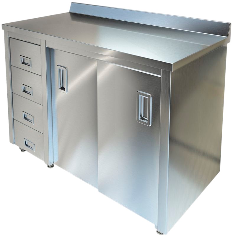 Производственный стол-тумба Техно-ТТ СПС-226/1807-Л предназначен для разделки и обработки пищевых продуктов, а также для расстановки и хранения посуды и кухонного инвентаря на предприятиях общественного питания, торговли и пищевых производствах. Стол оснащен бортом, 2 дверьми-купе и 4 выдвижными ящиками. Материал корпуса - нержавеющая сталь AISI 430, материал столешницы - нержавеющая сталь AISI 304, материал задней стенки - оцинкованная сталь.