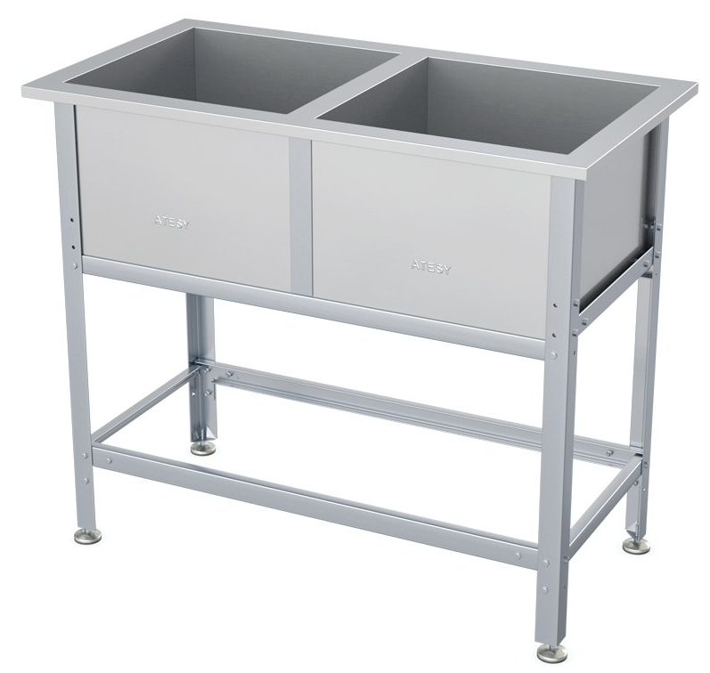 Моечная ванна ATESY ВСМ-С-2.430-02 серии Стандарт используется на предприятиях общественного питания и торговли для мытья столовой и кухонной посуды, инвентаря, овощей и фруктов, а также для оттайки замороженных пищевых продуктов. Каркас выполнен из профиля из оцинкованной стали толщиной 1,2 мм, ванны - из нержавеющей стали AISI 304 толщиной 0,8 мм, опоры регуляторов высоты ножек - из нержавеющей стали.
