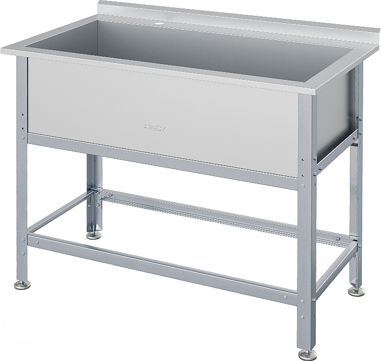 Моечная ванна ATESY ВСМ-Б-1.910.430-1-02 серии Бюджет предназначается для мытья посуды и кухонного инвентаря, овощей и фруктов, а также для оттайки замороженных продуктов. Кромки ванны имеют безопасную фальцовку, углы зашлифованы. Ножки регулируются по высоте. Тип конструкции - разборная. Материал каркаса - профиль из оцинкованной стали (толщина 1.2 мм), материал ванны - нержавеющая сталь AISI 430 (толщина 0.7 мм), материал опоры регуляторов высоты - нержавеющая сталь, ножки выполнены из пластика.