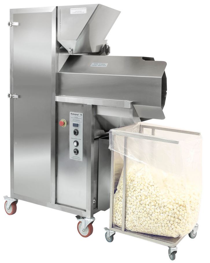 Аппарат для попкорна ТТМ Robopop 75 предназначен для раскрытия кукурузного зерна при помощи горячего воздуха на предприятиях пищевой промышленности. Распределение зерна по параболическому дну чаши рабочей камеры происходит равномерным слоем. Зерно постоянно находится в движении вокруг оси чаши, перемешивается и равномерно прогревается. Благодаря вихревому воздушному потоку внутри камеры, раскрывшиеся зерна немедленно удаляются из горячей зоны, что благотворно сказывается на качестве и вкусе попкорна.