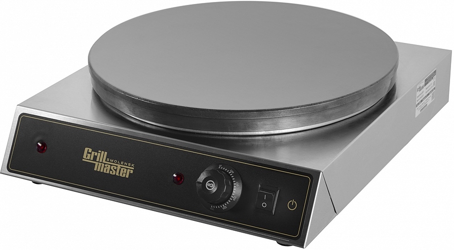 Блинница Grill Master Ф1БкрЭ предназначена для выпекания блинов. Жарочная поверхность блинницы изготовлена из чугуна. Распределение тепла происходит равномерно по всей поверхности благодаря особому расположению нагревательных элементов. Встроенный терморегулятор позволяет настраивать температуру. Гладкая поверхность позволяет готовить блины с минимальным добавлением масла. Чугун обладает антипригарным свойством, что минимизирует возможность прилипания блинов.