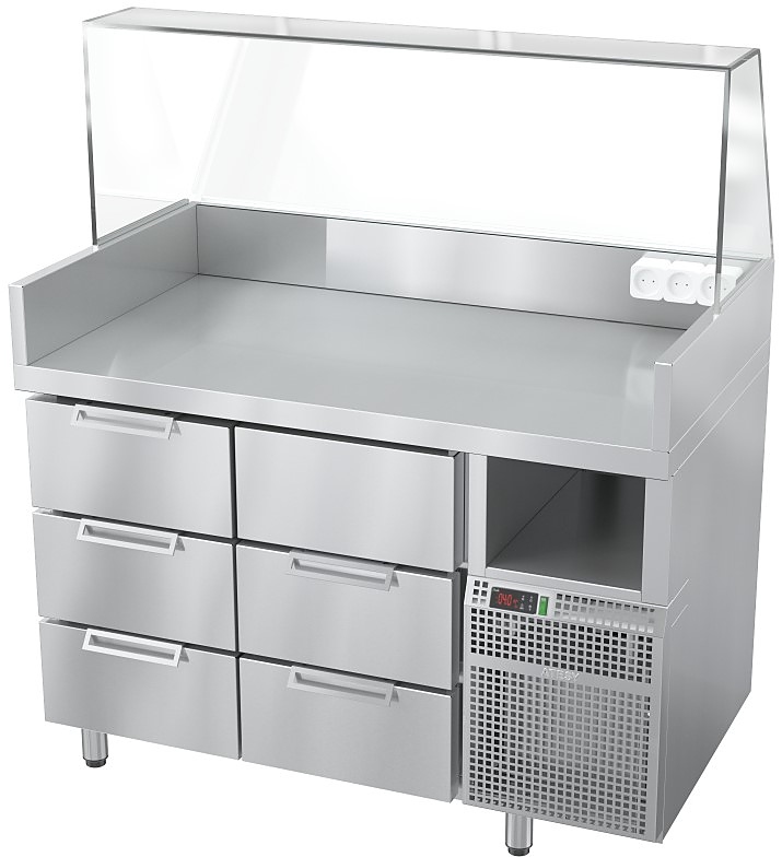 Станция для бургеров и хот-догов ATESY Бавария БХС-1235.700-02-1 используется на предприятиях общественного питания, торговли и пищевых для производствах с целью комплексного оснащения места для приготовления и продажи хот-догов и бургеров, а также хранения охлажденных полуфабрикатов, начинок, соусов и хлебобулочных изделий. Нейтральная ниша для хранения инвентаря и посуды, охлаждаемые гастронормированные ящики (GN 1/1, максимально допустимая глубина устанавливаемых гастроемкостей - 150 мм), температурный режим станции регулируется с помощью встроенного контроллера (есть возможность программирования). Материал станции - нержавеющая сталь.