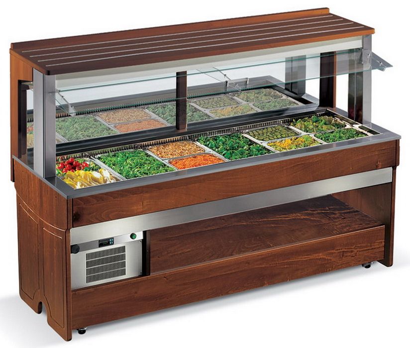 • Корпус салат-бара изготовлен из цельной древесины твёрдых пород, толщина составляет не менее 30 мм. Отделка может быть подобрана в соответствии с концепцией вашего заведения из трёх стандартных цветов: тёмный орех, светлый дуб и неокрашенное дерево.