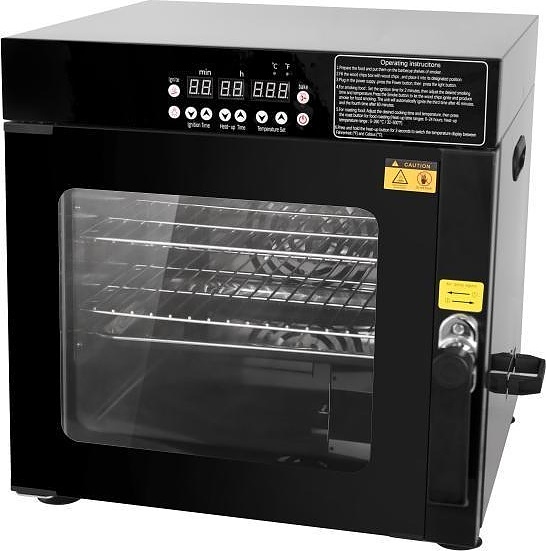 Коптильная камера Airhot ESM-102 используется на предприятиях общественного питания, торговли и пищевых производствах для горячего и холодного копчения продуктов. Модель оснащена электронным управлением, 3 цифровыми дисплеями индикации, таймером, вытяжным отверстием, полками-решетками, поддоном для сбора масла и жира, ящиком для древесной щепы и рукояткой. Материал корпуса - высококачественная нержавеющая сталь AISI 201, материал полок - металл с хромированной поверхностью.